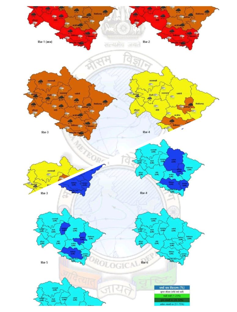 उत्तराखंड में बीते दिनों से लगातार बारिश से लगभग सभी पहाड़ी राज्यों की स्थिति ठीक नहीं ,जगह जगह भूस्खलन, सड़क मार्ग टूट चुके है।आगमी दिनों में भी मौसम विभाग की सूचना अनुसार29 जून से 02 जुलाई 2025 तकराज्य के कई जिलों में भीषण वर्षा की संभावना जताई है।जानकारी के अनुसार निम्न जिलों में रेड,ऑरेंज दिया गया है ।