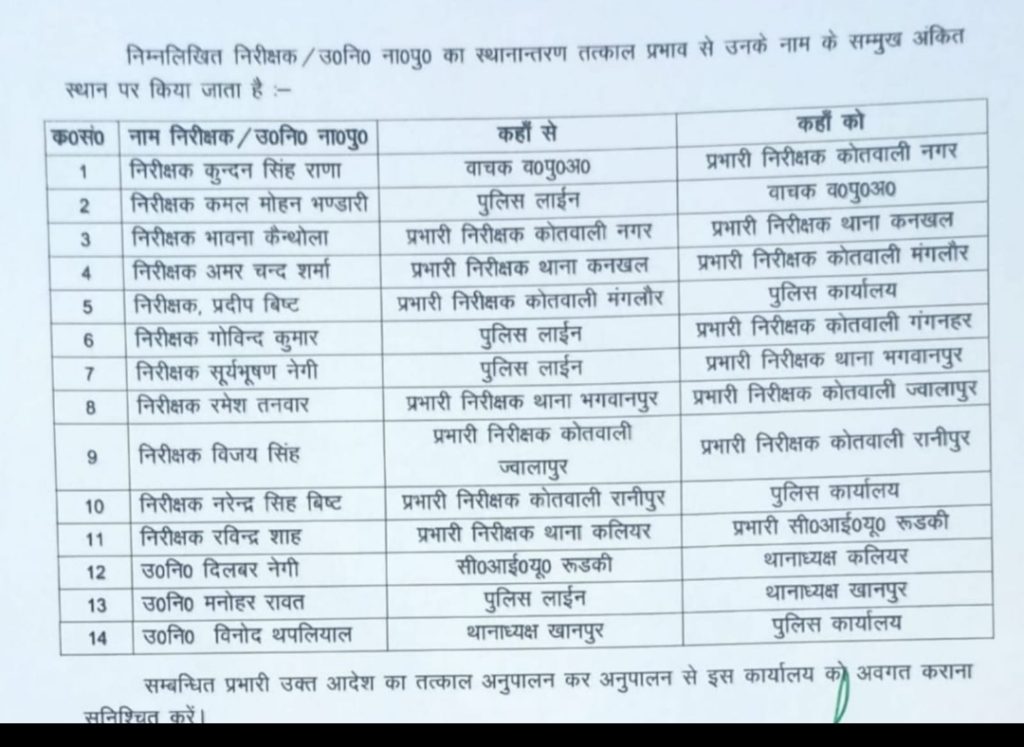 हरिद्वार में भी लोक सभा चुनाव को देखते हुए हरिद्वार के वरिष्ठ पुलिस अधीक्षक ने 14 निरीक्षक, उप निरीक्षक को तत्काल प्रभाव से स्थानांतरण किया है