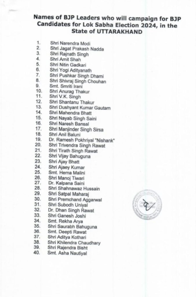 उत्तराखंड : भारतीय जनता पार्टी लोकसभा चुनाव को लेकर अपनी कमर कस चुकी है ऐसे में एक से बढ़कर एक स्टार प्रचारकों का उत्तराखंड में आना जारी है।ऐशे में आज पार्टी के प्रदेश मीडिया प्रभारी मनवीर सिंह चौहान ने फ़ाइनल 40 स्टार प्रचारकों की सूची मीडिया को सौंपी ।इनमें प्रमुख प्रधानमंत्री मोदी,राष्ट्रीय अध्यक्ष जेपी नड्डा, रक्षा मंत्री राजनाथ सिंह, केंद्रीय मंत्री नितिन गडकरी, स्मृति ईरानी, मध्य प्रदेश के पूर्व मुख्यमंत्री शिवराज सिंह समेत कई केंद्रीय नेता उत्तराखंड की जनता को लुभाने का प्रयास करेंगे ।