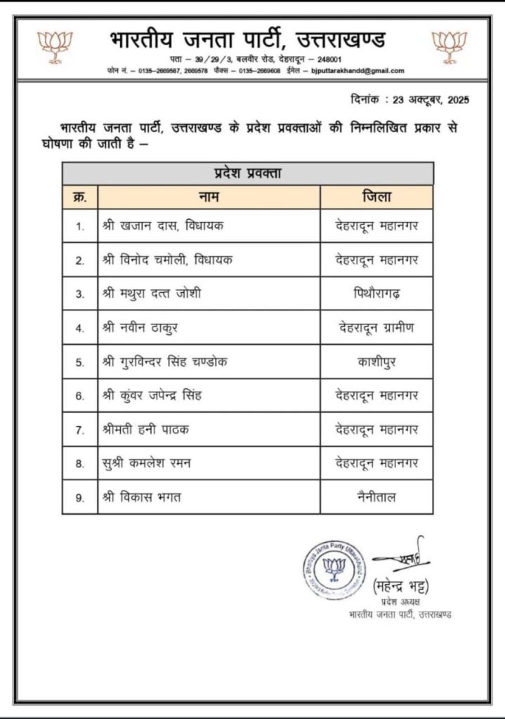 इसके अलावा, पिथौरागढ़ जिले से मथुरादत्त जोशी, काशीपुर से गुरविंदर सिंह चंडोक और नैनीताल जिले से विकास भगत को प्रवक्ता की जिम्मेदारी दी गई है।