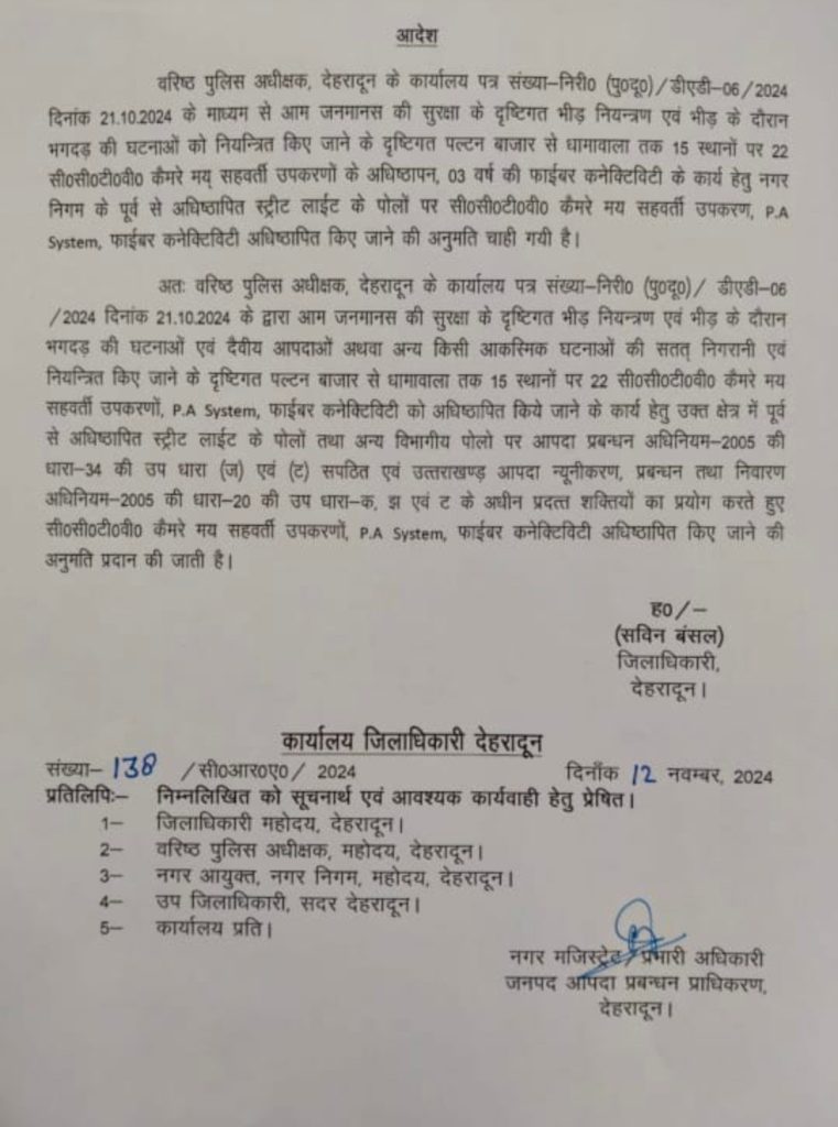 पल्टन बाजार से धामावाला तक पूर्व अधिष्ठापित स्ट्रीट लाईट के पोलों तथा अन्य विभागीय पोलो पर स्थापित होगें सीसीटीवी कैमरै, डीएम सविन बंसल ने जारी किये आदेश।