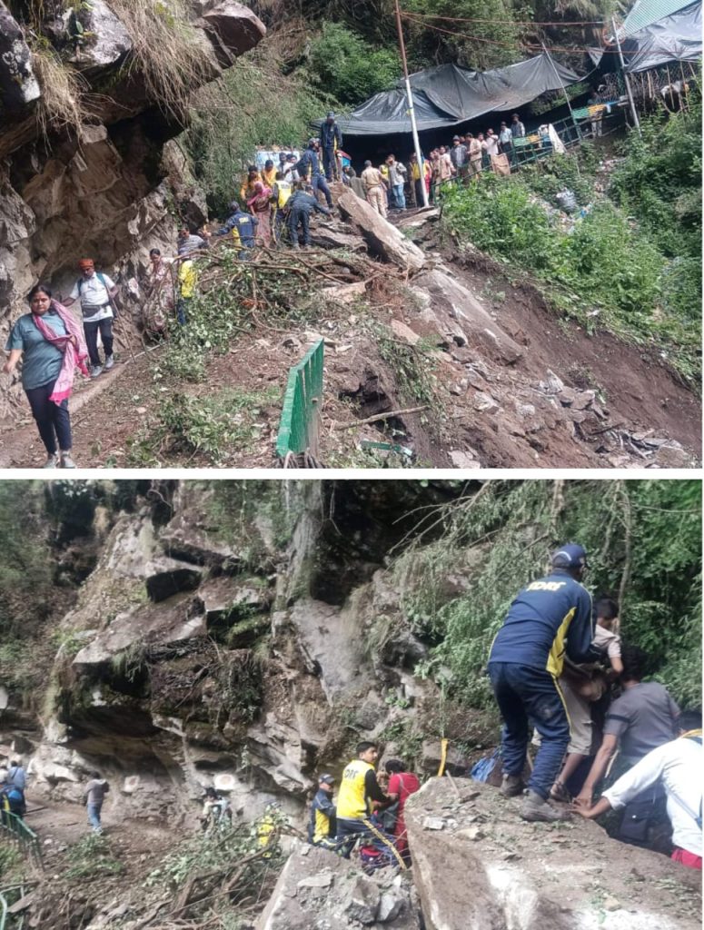 आज दिनांक 23 जून 2025 जनपद उत्तरकाशी स्थित यमुनोत्री धाम पैदल मार्ग पर शाम करीब 4 बजे भैरव मन्दिर के निकटजानकी चट्टी से लगभग 03 किलोमीटर आगेनौ कैंची पर भारी भू-स्खलन/स्लाईडिंग हुआ ,बताया जा रहा है कि भू स्खलन की चपेट में 2 से 3यात्री आ गये है ।पुलिस व एसडीआरएफ की टीम मौके पर राहत एवं बचाव कार्य में जुटी हैं।बताया जा रहा एक घायल का रेस्क्यू कर उपचार हेतु जानकीचट्टी पहुंचाया जा चुका है ,अन्य को रेस्क्यू करने की कोशिश जारी है ।