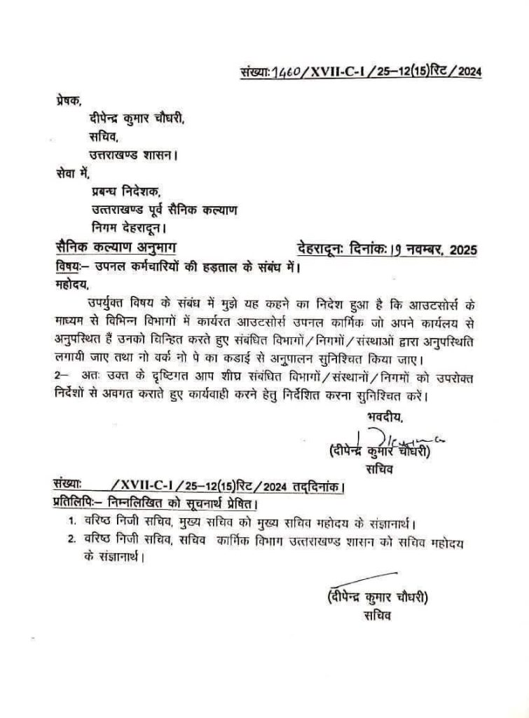 सरकार ने उपनल कर्मियों की अनुपस्थिति पर भी सख्त रुख अपनाया है।सचिव दीपेंद्र कुमार चौधरी ने उपनल के प्रबंध निदेशक को पत्र जारी कर यह स्पष्ट निर्देश दिए कि जो भी उपनल कर्मचारी अपने कार्यस्थल पर उपस्थित नहीं है, उसकी अनुपस्थिति चिह्नित की जाए।सभी विभाग, निगम और संस्थाएं अनुपस्थित कर्मचारियों की सूची तैयार करें।साथ ही ‘नो वर्क, नो पे’ सिद्धांत का कड़ाई से पालन किया जाए।यानी—जो कर्मचारी काम पर नहीं आएगा, उसका मानदेय काटा जाएगा।सरकार के इस आदेश के बाद कई विभागों में अनुपस्थित कर्मचारियों की पहचान करने की प्रक्रिया शुरू हो गई है।
