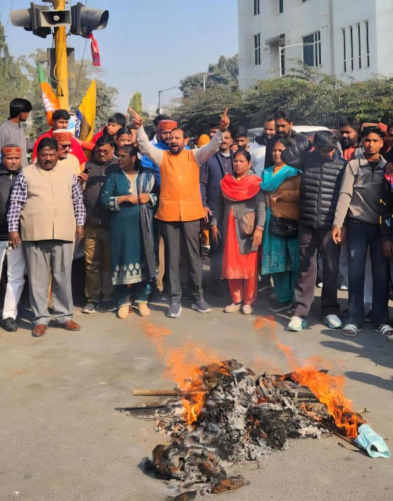 Dehradun, 2 Jan: Under the leadership of Bhagwat Prasad Makwana, National Executive Member, former National Vice President of the BJP Scheduled Caste Morcha, Uttarakhand, hundreds of workers of the morcha gathered at the BJP Metropolitan Office, here, today. They were protesting against the alleged continuous misinformation campaign being carried out by the Congress against senior BJP leaders. They marched to Lansdowne Chowk and burned an effigy of the Congress party, raising strong slogans against it.
