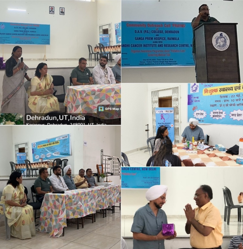 आज डी.ए.वी (पी.जी.) • कॉलेज से Outreach cell “प्रयास” द्वारा गंगा प्रेम हॉस्पिस रायवाला एवं राजीव गांधी कैंसर इंस्टीट्यूट एवं रिसर्च सेंटर के सहयोग से जागरूकता कार्यक्रम आयोजित किया गया जिसमें राजीव गांधी इंस्टीट्यूट से आये डा0 ब्रजेश द्वारा मुँह से संबंधित कैंसर से बचाव तथा डा0 मुस्कान द्वारा सर्वाइकल कैंसर की रोकथाम के बारे में जानकारी दी गई। इसके साथ ही जी.पी.एच. रायवाला से आये डा0 तरनजीत ने “धैलियेटिव कैयर” एवं “हास्पेस’ के बारे में वह अन्य कई प्रकार के कैंसर संबंधित बीमारियों के बारे में जानकारी दी.वार्ता के पश्चात फ्री मैडिकल चेकप व फ्री दवाइयों का वितरण भी किया गया। लगभग 150 छात्रों व स्टाफ ने इस मेडिकल चेकप का लाभ उठाया।इस अवसर पर विश्वविद्यालय के प्राचार्य एस. के. सिंह ने सभी चिकित्सको का धन्यवाद किया। इस कार्यक्रम में मुख्य रूप से उपस्थित रहे डा0 बीना जोशी, डा0 सुमन त्रिपाठी, डा0 मुडुला शर्मा, डा0 गीतांजली, डा0 अनुपमा सक्सेना आदि ने सहभागिता की।