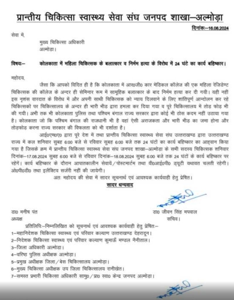 पूरे उत्तराखंड में आज डॉक्टरों की हड़ताल है कलकत्ता में हुए रेप मामले के विरोध में