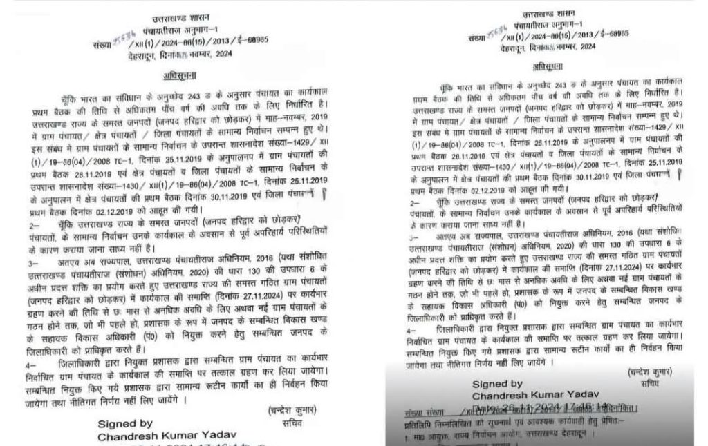 बताते चले कि हरिद्वार जिले को छोड़ उत्तराखंड के 12 जिलों में ग्राम पंचायतों और क्षेत्र पंचायतों में पंचायती राज विभाग ने प्रशासक नियुक्त कर दिए हैं।पंचायती राज सचिव चंद्रेश यादव ने इस बारे में आदेश जारी किया है
