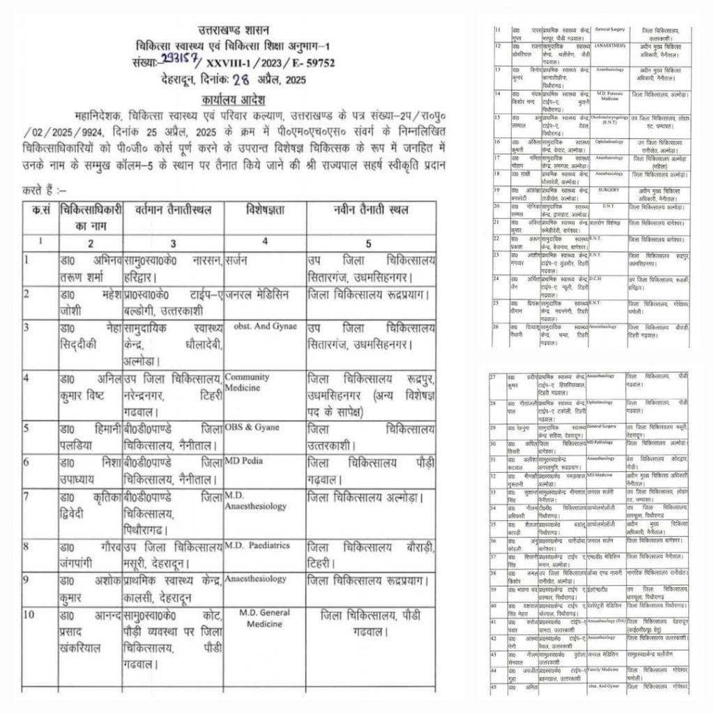 जिनको शीघ्र अपने नवीन तैनाती स्थल पर कार्यभार ग्रहण करने के आदेश हुए है व आदेश में यह भी स्पष्ट किया गया है कि यदि कोई चिकित्सक निर्धारित समय पर कार्यभार नहीं ग्रहण करता है तो उसके विरुद्ध नियमानुसार कार्रवाई की जाएगी।