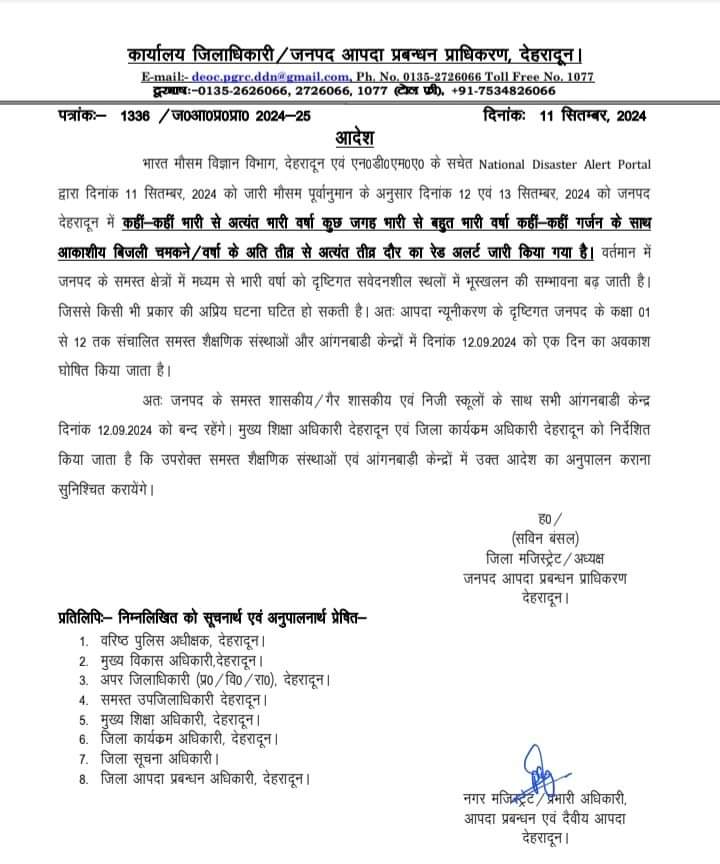 जिलाधिकारी देहरादून ने कल गुरुवार को सभी स्कूलों में अवकाश घोषित कर दिया है। आदेश के मुताबिक भारी बारिश की संभावना के चलते कक्षा एक से 12 तक के सभी स्कूल बंद रहेंगे। वही आंगनबाड़ी केंद्र में भी छुट्टी रहेगी।