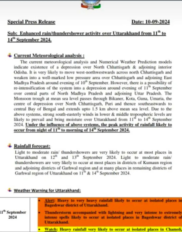 11 से 14 सितंबर तक उत्तराखंड के कई जिलों में भारी बारिश की जताई आशंका