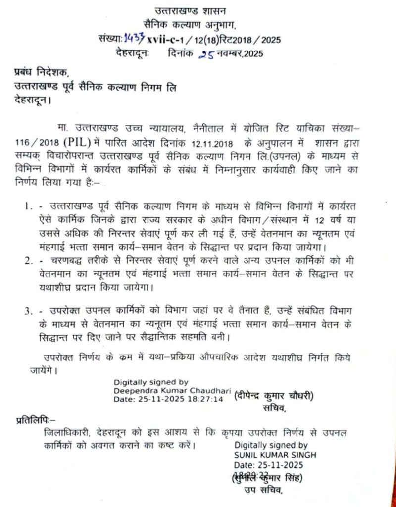 मुख्यमंत्री श्री पुष्कर सिंह धामी के निर्देश पर राज्य सरकार ने उत्तराखण्ड पूर्व सैनिक कल्याण निगम लिमिटेड (UPNL) के माध्यम से विभिन्न विभागों में कार्यरत कार्मिकों के हित में एक महत्वपूर्ण निर्णय लिया है। यह निर्णय उत्तराखण्ड उच्च न्यायालय, नैनीताल में योजित रिट याचिका संख्या 116/2018 (PIL) में पारित आदेश दिनांक 12.11.2018 के अनुपालन में, उपनल प्रतिनिधियों की मुख्यमंत्री से हुई बैठक के बाद शासन स्तर पर सम्यक विचार-विमर्श के उपरांत लिया गया है।