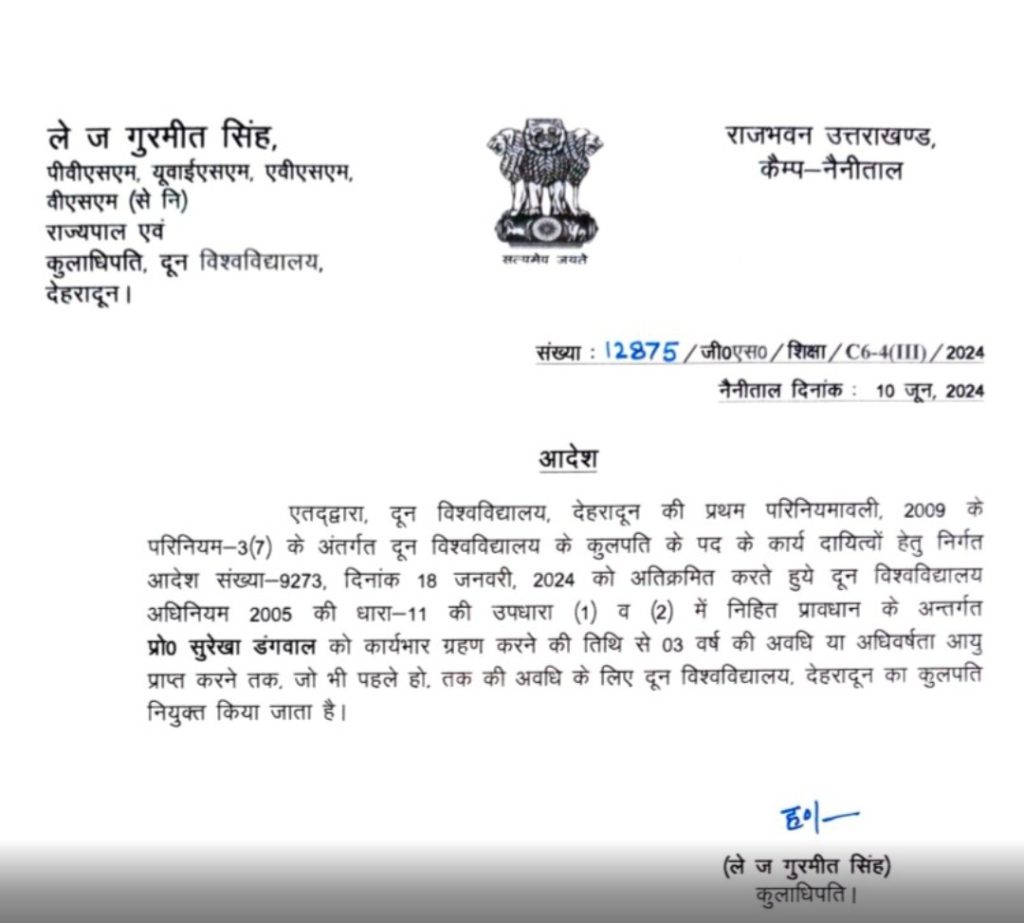 अतिक्रमित करते हुये दून विश्वविद्यालय अधिनियम 2005 की धारा-11 की उपधारा (1) व (2) में निहित प्रावधान के अन्तर्गत प्रो० सुरेखा डंगवाल को कार्यभार ग्रहण करने की तिथि से 03 वर्ष की अवधि या अधिवर्षता आयु प्राप्त करने तक, जो भी पहले हो. तक की अवधि के लिए दून विश्वविद्यालय, देहरादून का कुलपति नियुक्त किया जाता है।