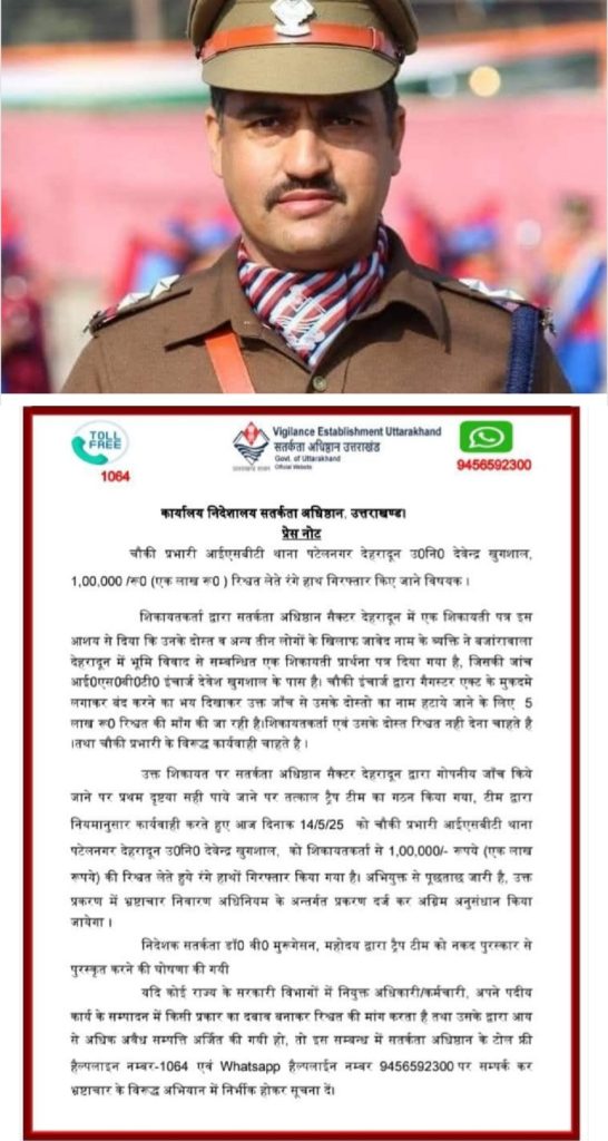 देहरादून :खाकी और रिश्वत किस्से नये नहीं है ,लेकिन वक़्त की बात होती है कि किसीके किस्से छप जाते है ,किसीके किस्से छुप जाते है ।यहीं हुआ देहरादून पुलिस के चर्चित चेहरे उपनिरीक्षक देवेश खुशगाल के साथ ,कभी देहरादून पुलिस के आंखों का तारे देवेंद्र इस वक्त आईएसबीटी चौकी प्रभारी है ।जिनको कल सतर्कता अधिष्ठान (विजिलेंस) की टीम ने 1,00,000 रुपये की रिश्वत लेते हुए रंगे हाथ गिरफ्तार किया।