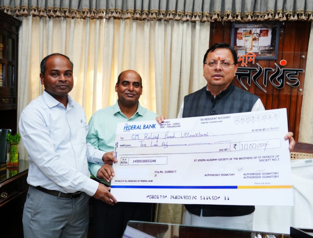 DEHRADUN, 25 Oct: The Management team of St Joseph’s Academy called on Chief Minister Pushkar Singh Dhami, at the Chief Minister’s Camp Office here on Saturday. On this occasion, the representative of one of the leading schools of Dehradun, handed over a donation cheque of Rs 10 lakh to Chief Minister towards the Chief Minister’s Relief Fund. The donation is intended for disaster relief and reconstruction works in Uttarakhand.