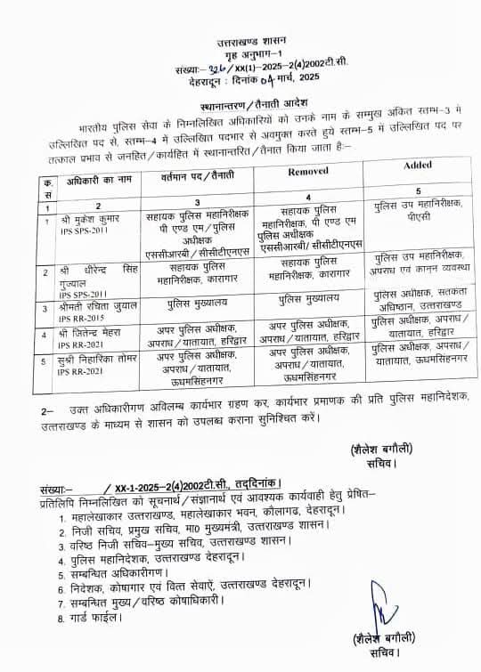 आज दिनांक 4 मार्च 2025 को पुलिस विभाग में पांच अधिकारों को नई जिम्मेदारी दी गई, देखिये भारतीय पुलिस सेवा के अधिकारियों के स्थानांतरण
