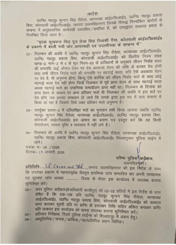 एसएसपी के आदेश पर उपनिरीक्षक कुंदन सिंह रौतेला (थानाध्यक्ष, आईटीआई थाना) और उपनिरीक्षक प्रकाश बिष्ट (कोतवाली आईटीआई) को तत्काल प्रभाव से निलंबित किया गया है। दोनों अधिकारियों के खिलाफ अनुशासनिक कार्रवाई प्रस्तावित/प्रचलित है। निलंबन अवधि के दौरान उन्हें मूल नियम-53 के तहत अर्द्ध औसत वेतन के बराबर जीवन निर्वाह भत्ता मिलेगा और पुलिस लाइंस में रहना अनिवार्य होगा।