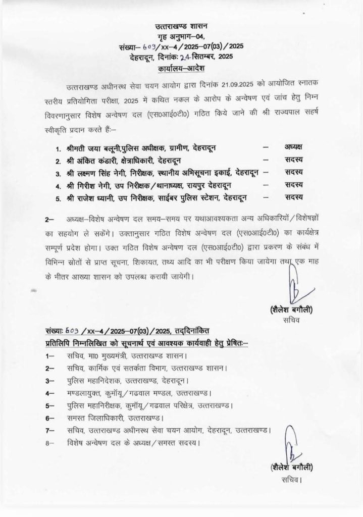 उत्तराखंड ब्रेकिंग : पूरे उत्तराखंड में युवाओं के विरोध को देखते हुए ,उत्तराखंड सरकार द्वारा UKSSSC भर्ती परीक्षा मामले में जांच हेतु विशेष अन्वेषण दल(एस०आई०टी०) गठित किया गया !! – myuttarakhandnews.com